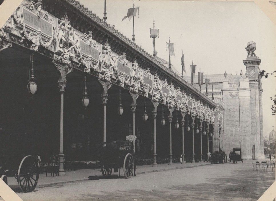 Esta imagen de Neurdein Frères muestra las cuatro primeras casas de esta sección – Escandinava, Romana, Medieval y Renacimiento, y la cúpula del Pabellón entre las dos últimas