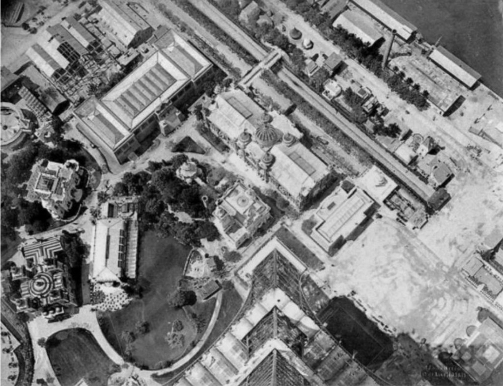 La foto demuestra lo encerrado que estaba el Pabellón Argentino. El de Brasil, un gran edificio de planta casi cuadrada, conectado por una galería a un invernadero, le cubría casi toda la fachada delantera, y los de México y de la Compañía de Suez/Panamá, las laterales.