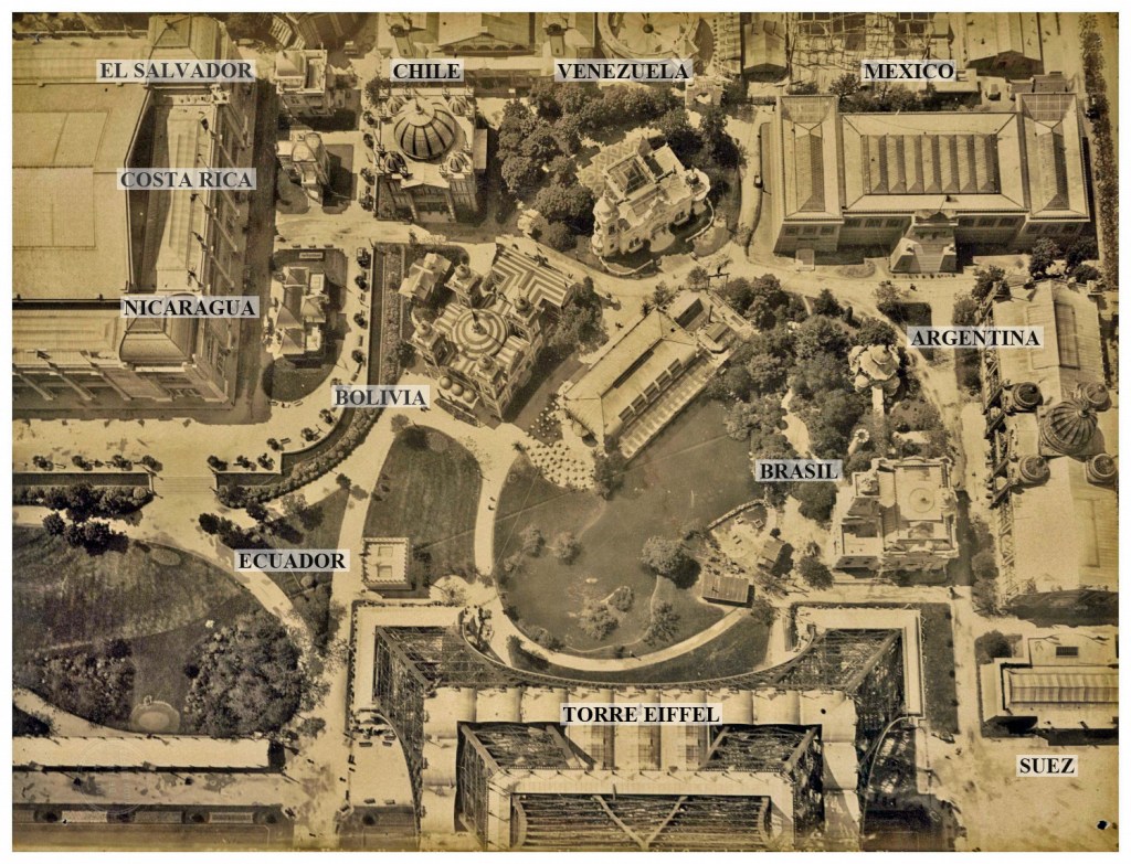 Como lo habían hecho en la anterior exposición, en 1878, los organizadores planeaban agrupar a los países latinoamericanos en un único edificio. La idea no fue aceptada y todos terminaron erigiendo pabellones individuales. Por la falta de espacio para entonces disponible, quedaron amontonados en una esquina del Campo de Marte, como muestra una vista tomada desde el tercer nivel de la Torre Eiffel. El Argentino, en el borde derecho de la imagen. No aparecen allí los de Uruguay, República Dominicana, Paraguay y Guatemala, que estaban a la izquierda del de El Salvador, detrás del gran Palacio de Artes Liberales.
