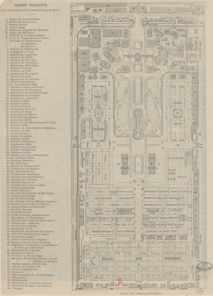 Un plano detalla las construcciones de la Exposición en el Campo de Marte. Aquí, el Sena está en el borde superior de la imagen. Vemos a los pabellones latinoamericanos a la izquierda de la Torre Eiffel (Argentina es el Nº 3), debajo de la cual está el Jardín Central. Lo flanqueaban los grandes pabellones de Artes Liberales (a la izquierda) y Bellas Artes (a la derecha). Más abajo, pabellones europeos, escoltando los dos de la Ciudad de París. Luego, el gran Pabellón Central, y finalmente el gigantesco Palacio de las Máquinas, sin ninguna columna interna.